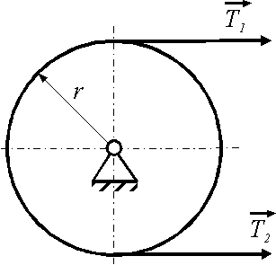 Определить угловое ускорение диска радиуса r = 0,3 м массой m = 50 кг, если натяжения ведущей и ведомой ветвей ремня соответственно равны