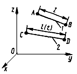 Уравнения связей для материальных точек А, В и С, D, соединенных соответственно стержнями 1 и 2 постоянной l = const и переменной l(t) длины, имеют вид: (xB- xA)2 + (yB- yA)2 + (zB- zA)2 − l2 = 0; (xD- xC)2 + (yD- yC)2 + (zD- zC)2 − [l(t)]2 = 0. Укажите номер стержня, накладывающего на точки голономную стационарную связь. Ответ округлить до целых.