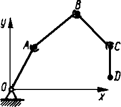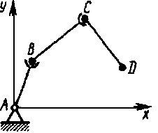 Материальные точки А, В, С и D соединены между собой невесомыми жесткими стержнями постоянной длины. Точка А неподвижна, а точки В, С и D движутся в плоскости Аху. Определить число степеней свободы системы материальных точек. Ответ округлить до целых. |