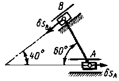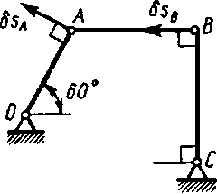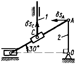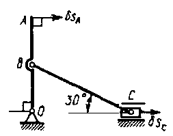 Определить отношение между возможными перемещениями δsA точки А кривошипа ОА и δsC точки С ползуна, если длины ОВ = АВ. Ответ округлить до целых. |