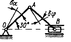 Определить отношение между возможными угловыми перемещениями δφ шатуна АВ и δα кривошипа ОА, если длины ОА = АВ. Ответ округлить до целых. |