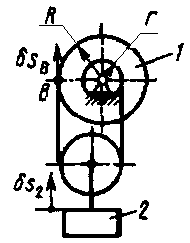 Определить отношение между возможными перемещениями δsB точки В барабана 1 и δs2 груза 2 дифференциального ворота, если радиусы R = 2r = 20 см. Ответ округлить до целых. |