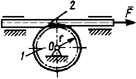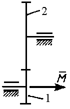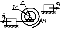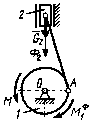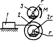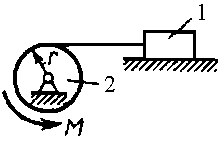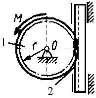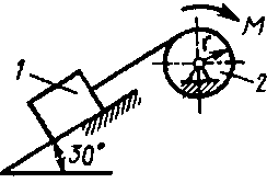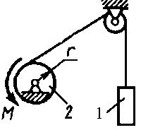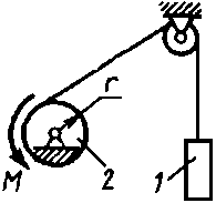 Определить момент М пары сил, который необходимо приложить к барабану 2 радиуса r = 20 см для равномерного подъема груза 1 весом 200 Н. Ответ округлить до целых. |