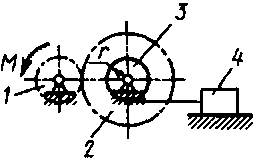 Механизм, состоящий из зубчатых колес 1, 2 с числом зубьев z2 = 2 z1 н барабана 3, жестко скрепленного с колесом 2, равномерно перемещает груз 4 весом 4·103 Н. Определить момент М пары сил, если коэффициент трения скольжения груза f = 0,2 и радиус барабана r = 10 см. Ответ округлить до целых. |
