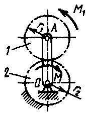 К зубчатому колесу 1 приложена пара сил с моментом М1 = 40 Н·м. Определить момент М пары сил, который необходимо приложить к кривошипу ОА, для того чтобы механизм находился в равновесии, если радиусы r1 = r2. Ответ округлить до целых. |
