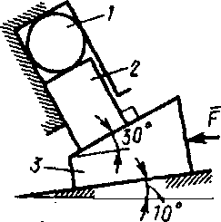 На тело 3 действует сила F = 460 Н параллельно его плоскости опоры. Определить модуль силы давления тела 2 на сжимаемое тело 1 при равновесии системы. Ответ округлить до целых. |