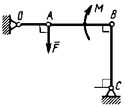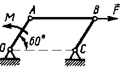 Определить модуль уравновешивающей силы F, приложенной к кривошипу ОА в точке А шарнирного четырехзвенника ОАВС, если на шатун АВ = 0,4 м действует пара сил с моментом M = 40 Н·м . Ответ округлить до целых. |