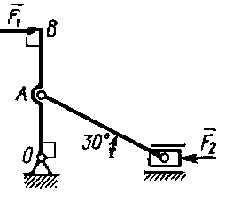 Определить модуль силы F2, которую необходимо приложить к ползуну, для того чтобы механизм находился в равновесии, если сила F1 = 100 Н и длина ОА = АВ. Ответ округлить до целых. |