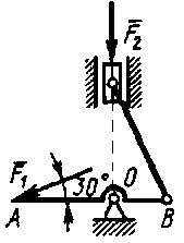 Определить модуль силы F1, которую необходимо приложить к кривошипу АВ, для того чтобы механизм находился в равновесии, если сила F2 = 100 Н и расстояние ОА = 2 ОВ. Ответ округлить до целых. |