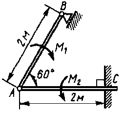 Горизонтальная балка АС заделана концом С в вертикальную стену и нагружена парой сил с моментом М2 = 600 Н·м. Балка АВ, опирающаяся на подвижную опору своим конwом B, натужена папой сип с моментом М1 = 400 Н·м. Определить модуль момента заделки. Ответ округлить до целых.