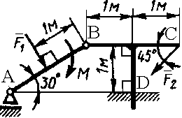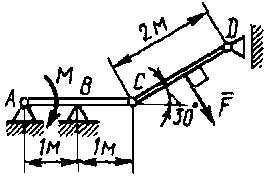 Балки АС и СD соединены между собой шарниром С. Горизонтальная балка АС, опирающаяся на ребро В призмы, нагружена парой сил с моментом М = 2·103 Н·м. Балка СD нагружена посередине силой F = 4·103 Н. Определить модуль реакции опоры В. Ответ округлить до десятков. |