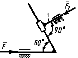 На стержень 2 механизма действует горизонтальная сила F = 3 кН. Определить в кН силу давления масла на поршень гидроцилиндра 1 в положении равновесия системы. Ответ округлить до целых.
