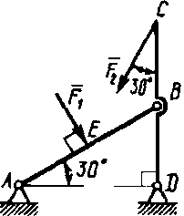 Стержни АВ и СD соединенные между собой и с неподвижным основанием шарнирами, нагружены силами F1 = 200 Н и F2 = 600 Н. Определить модуль горизонтальной составляющей реакции шарнира А, если длины АЕ = ВЕ = ВС = ВD = 1 м. Ответ округлить до целых. |