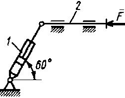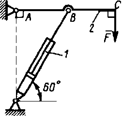 С помощью гидроцилиндра 1 удерживается в равновесии стрела 2, на конце которой приложена вертикальная сила F = 400 Н. Определить в кН силу давления масла на поршень гидроцилиндра, если длина АВ = ВС. Ответ округлить до тысячных. |