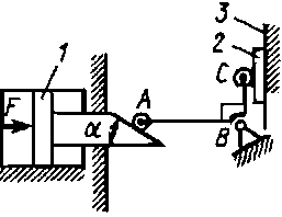 На поршень 1 действует сила F = 250 Н. Определить, с какой силой рычаг АВС прижимает деталь 2 к основанию 3 в положении равновесия системы, если угол α = 30° и расстояния АВ = 0,8 м, ВС = 0,4 м. Ответ округлить до целых. |