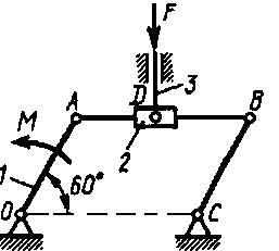 На шатун АВ шарнирного параллелограмма ОАВС надета втулка 2, к которой с помощью шарнира D прикреплен вертикальный стержень 3. Определить в случае равновесия механизма момент М пары сил, если сила F = 400 Н и длина кривошипа ОА = 0,2 м. Ответ округлить до целых. |