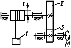 Определить момент М пары сил, который необходимо приложить к валу зубчатого колеса 3 для равномерного подьема груза 1 весом 900 Н. Радиус барабана r = 0,2 м, числа зубьев колес z2 = 2 3. Ответ округлить до целых. |