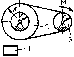Определить модуль момента М пары сил, который необходимо приложить к шкиву 3 для равномерного подьема груза 1 весом 900 Н. Радиусы шкивов R = 2 r = 40 см. Ответ округлить до целых.