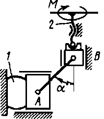 На винт 2 с шагом h = 1 см действует пара сил с моментом М = 1 Н·м. Определить силу давления на сжимаемый предмет 1 в положении равновесия механизма пресса, при котором угол α = 45°. Ответ округлить до целых. |