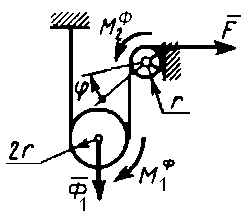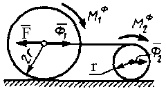 Определить модуль силы F, если главные векторы сил инерции катков Ф1 = 4 Н, Ф2 = 1 Н, главные моменты сил инерции М1ф = 0,8 Н·м, М2ф = 0,1 Н·м, радиус r = 0,1 м. Ответ округлить до целых. |