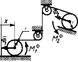 Определить обобщенную силу инерции, соответствующую обобщенной координате х, если силы инерции Ф1 = Ф2 = 10 Н, моменты сил инерции М1Ф = М2Ф = 1 Н·м. радиус r = 0,1 м. Ответ округлить до целых.