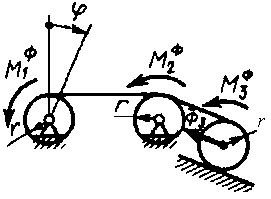 Определить обобщенную силу инерции, соответствующую обобщенной координате φ, если сила инерции Ф3 = 10 Н, моменты сил инерции М1Ф = М2Ф = М3Ф = 1 Н·м, радиус r = 0,1 м. Ответ округлить до целых.