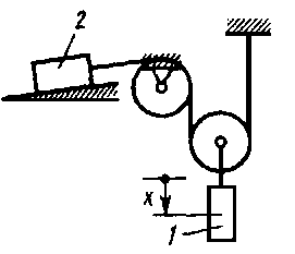 Определить обобщенную силу инерции, соответствующую обобщенной координате х. Массы тел m1 = m2 = 1 кг, ускорение x'' = 1 м/с2, массами блоков пренебречь. Ответ округлить до целых. |