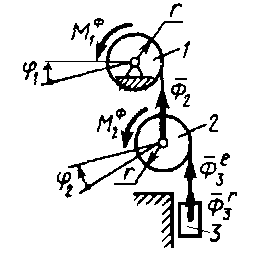 Определить обобщенную силу инерции, соответствующую обобщенной координате φ1, если сила инерции тела 2 Ф2 = 0,4 Н, переносная и относительная силы инерции тела 3 соответственно Фе3 = 0,2 Н, Фr3 = 0,1 Н, моменты сил инерции М1Ф = 0,4 Н·м, М2Ф = 0,1 Н·м, радиус r = 0,2 м. Ответ округлить до сотых.