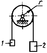 Грузы 1 и 2, массы которых m2 = 2 m1 прикреплены к тросу, переброшенному через блок радиуса r. Пренебрегая массой блока, определить ускорение грузов. Ответ округлить до сотых. |