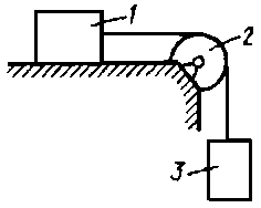 Два груза, массы которых m1 =m3 = 2 кг, соединены между собой нитью, переброшенной через блок 2, массой которого можно пренебречь. Определить ускорение грузов, если коэффициент трения скольжения между грузом 1 и плоскостью f = 0,1. Ответ округлить до сотых. |