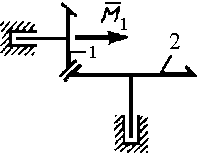 Определить угловое ускорение ε конического зубчатого колеса 1, если радиусы колес r1 = 0,15 м, m2 = 0,3 м, моменты инерции относительно осей вращения I1 0,02 кг·м2, I2 = 0,04 кг·м2, момент пары сил М1 = 0,15 Н·м. Ответ округлить до целых. |