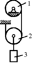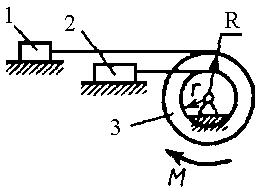 Определить модуль момента М пары сил, который необходимо приложить к шкиву 3 для равномерного подьема груза 1 весом 900 Н. Радиусы шкивов R = 2 r = 40 см. Ответ округлить до целых. |