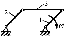 Пара сил с постоянным моментом М = 0,8 Н·м приводит в движение механизм, расположенный в горизонтальной плоскости. Кривошипы 1 и 2 – однородные стержни длиной l = 0,2 м и массой m1 = m2 = 1 кг, масса m3 = 2 кг. Определить угловое ускорение кривошипа 1. Ответ округлить до десятых. |