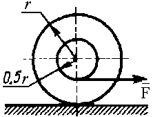 Балка 1 массой m1 = 200 кг лежит на валах 2 и 3, моменты инерции которых относительно оси вращения I1 = I2 = 0,1 кг·м2. Определить силу F, которую необходимо приложить к балке, чтобы сообщить ей ускорение а = 1 м/с2, если радиус r = 0,1 м. Ответ округлить до целых. |