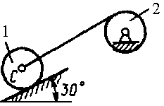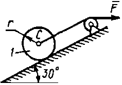 Определить модуль силы F, под действием которой центр С однородного сплошного катка 1, масса которого m1 = 20 кг, а радиус r = 0,4 м, движется вверх с постоянным ускорением аC = 1 м/с2. Ответ округлить до целых. |