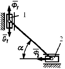 Определить силу тяжести G1 ползуна 1, если в момент времени, когда угол α = 45°, силы инерции ползунов Ф1 = Ф2 = 10 Н. Ответ округлить до целых. |