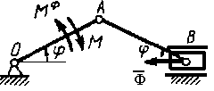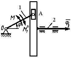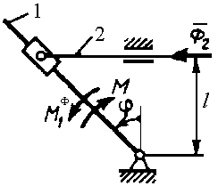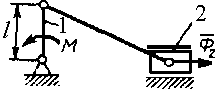 Определить модуль момента М пары сил, действующей на кривошип 1, если в момент времени, когда кривошип 1 перпендикулярен направляющим ползуна 2, сила инерции ползуна Ф2 = 10 Н. Длина кривошипа l = 0,1 м. Ответ округлить до целых.