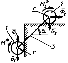 Определить силу тяжести G1 катка 1, если в момент времени, когда угол α = 45°, главные векторы сил инерции Ф1 = Ф2 = 10 Н, главные моменты сил инерции М1ф = М2ф = 0,5 Н·м. Радиус r = 0,1 м, массой тела 3 пренебречь. Ответ округлить до целых.
