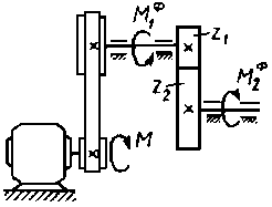 Определить модуль момента М пары сил, приводящей в движение редуктор, если главные моменты сил инерции М1ф = 0,1 Н·м, М2ф = 1 Н·м. Передаточное отношение ременной передачи i = 0,5, числа зубьев шестерен z1 = 50, z2 = 100. Ответ округлить до десятых.