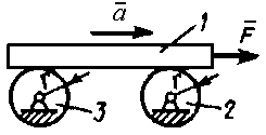 Балка 1 массой m1 = 200 кг лежит на валах 2 и 3, моменты инерции которых относительно оси вращения I1 = I2 = 0,1 кг·м2. Определить силу F, которую необходимо приложить к балке, чтобы сообщить ей ускорение а = 1 м/с2, если радиус r = 0,1 м. Ответ округлить до целых.
