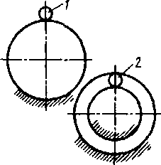 Шарик 1 катится по поверхности гладкого неподвижного цилиндра, а шарик 2 движется между двумя неподвижными цилиндрическими поверхностями. Укажите номер шарика, на который наложена удерживающая связь. Ответ округлить до целых.