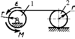 Определить угловое ускорение ε1 шкива 1, если заданы радиусы шкивов r1 = 0,05 м, r2 = 0,1 м, моменты инерции относительно осей вращения I1 = 0,01 кг·м2, I2 = 0,02 кг·м2, момент пары сил М = 0,15 Н·м. Ответ округлить до целых. |