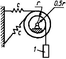 Определить период свободных вертикальных колебаний груза 1, если его масса m = 4 кг, коэффициент жесткости каждой пружины с = 100 Н/м, радиус r = 0,2 м. Ответ округлить до тысячных.