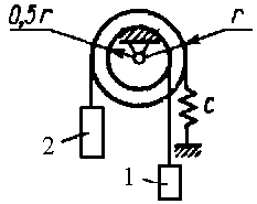 Определить угловую частоту свободных колебаний тела 1, если его масса m = 1 кг, коэффициент жесткости пружины с = 1 Н/см. Ответ округлить до целых. |
