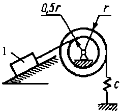 Определить период свободных вертикальных колебаний груза 1, если его масса m = 4 кг, коэффициент жесткости каждой пружины с = 100 Н/м, радиус r = 0,2 м. Ответ округлить до тысячных. |