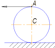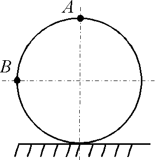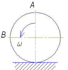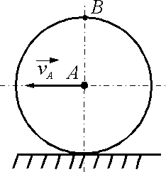 Определить скорость точки В колеса, если точка А колеса имеет скорость 2 м/с. Колесо катится без скольжения. |