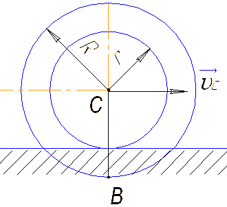 Скорость центра С ступенчатого колеса vc = 2 м/с, радиусы R = 0,3 м, r = 0,2 м. Определить скорость точки В. Колесо катится без скольжения. Ответ округлить до целых. |
