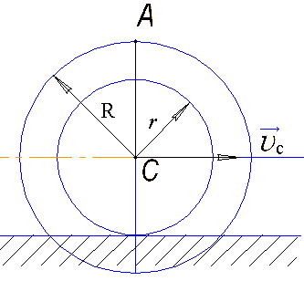 Скорость центра С ступенчатого колеса vc = 2 м/с, радиусы R = 0,3 м, r = 0,2 м. Определить скорость точки А. Колесо катится без скольжения. |