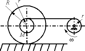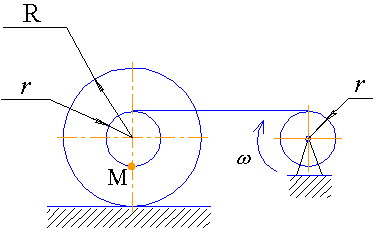 Угловая скорость барабана ω = 2 рад/с. Определить скорость точки М ступенчатого катка, катящегося без скольжения, если радиусы r = 0,1 м, R = 0,3 м. Ответ округлить до десятых. |