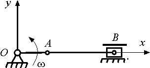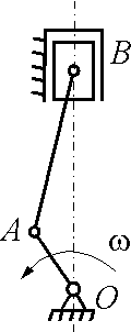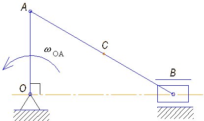Кривошип ОА вращается с постоянной угловой скоростью ω = 2 рад/с. Определить расстояние от точки А до мгновенного центра скоростей шатуна АВ, если длина кривошипа ОА = 1 м, а длина шатуна АВ = 3 м.